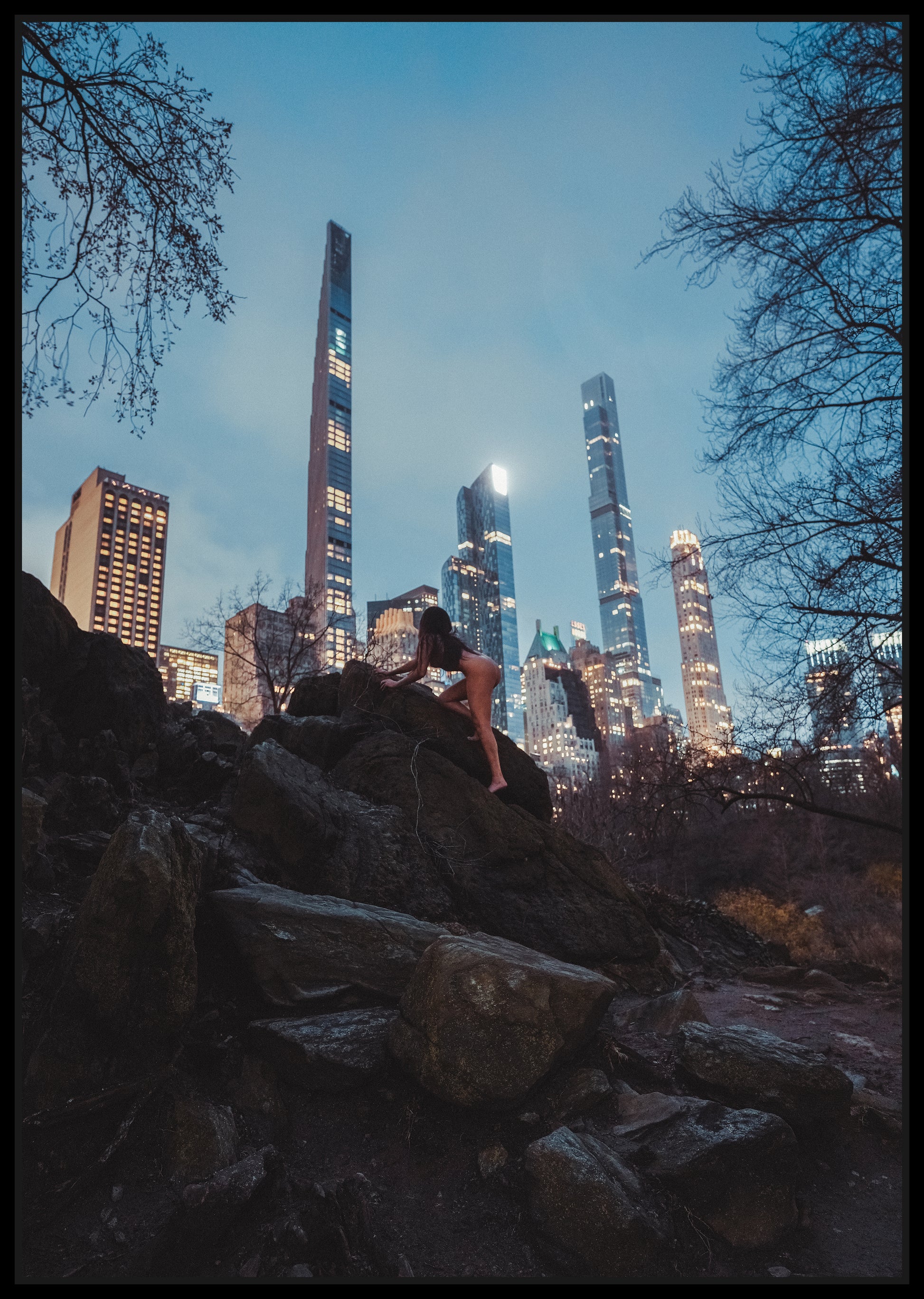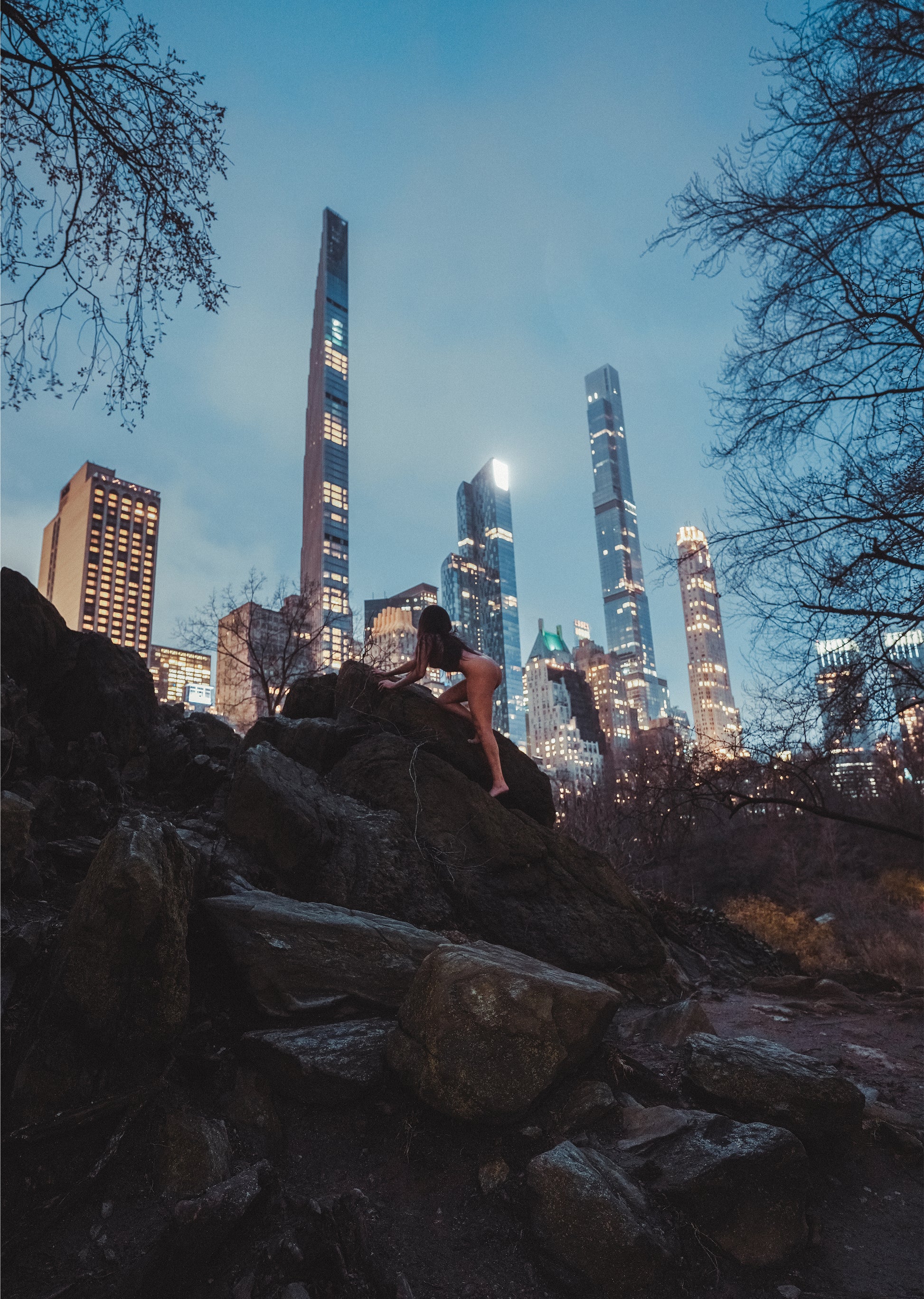 Shot in the iconic Central Park in New York. A contrasting view between the animalistic and raw nature of the human body crawling on the rocks and the mega skyscrapers in the distance. An astonishing piece because of its juxtaposition!