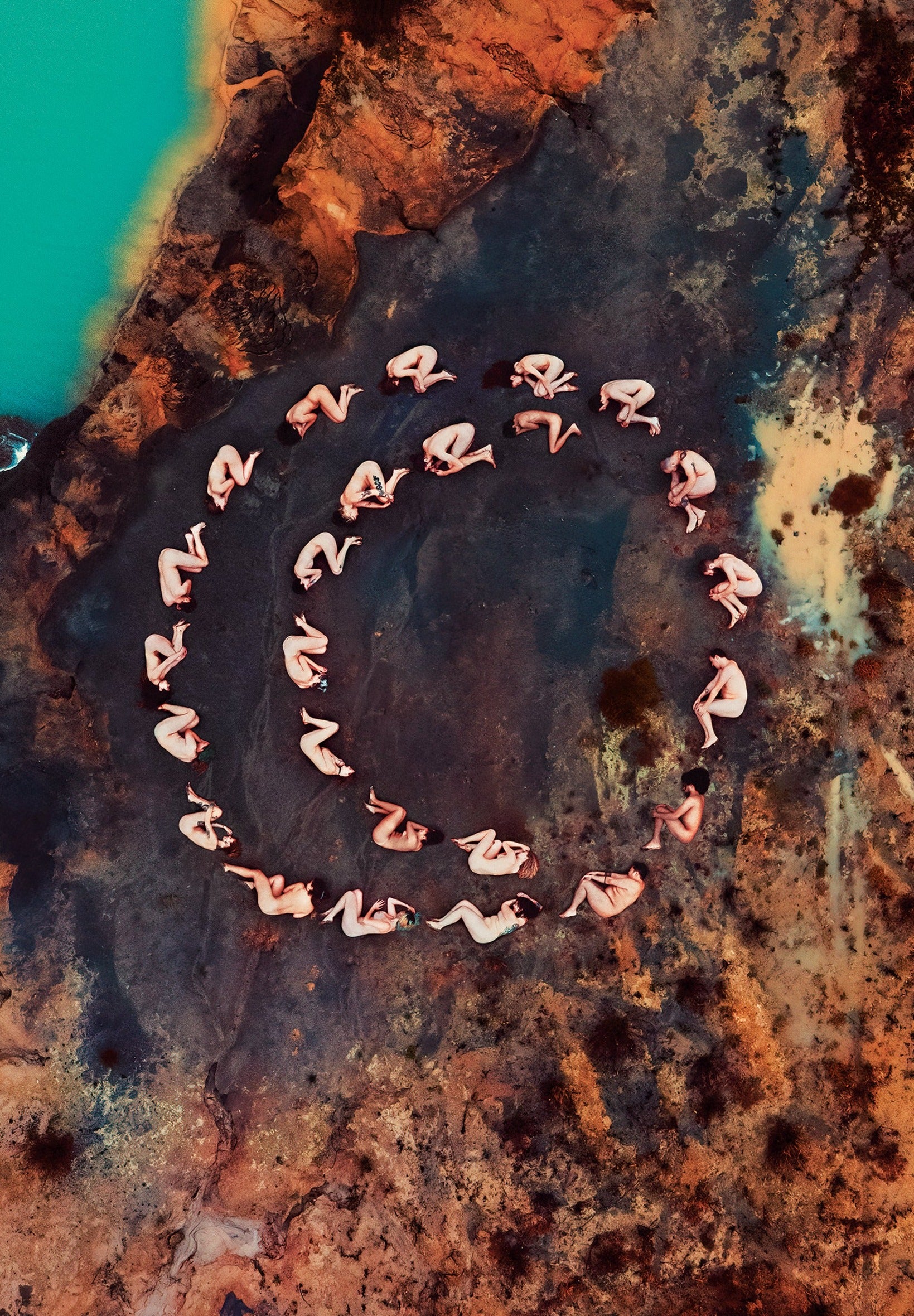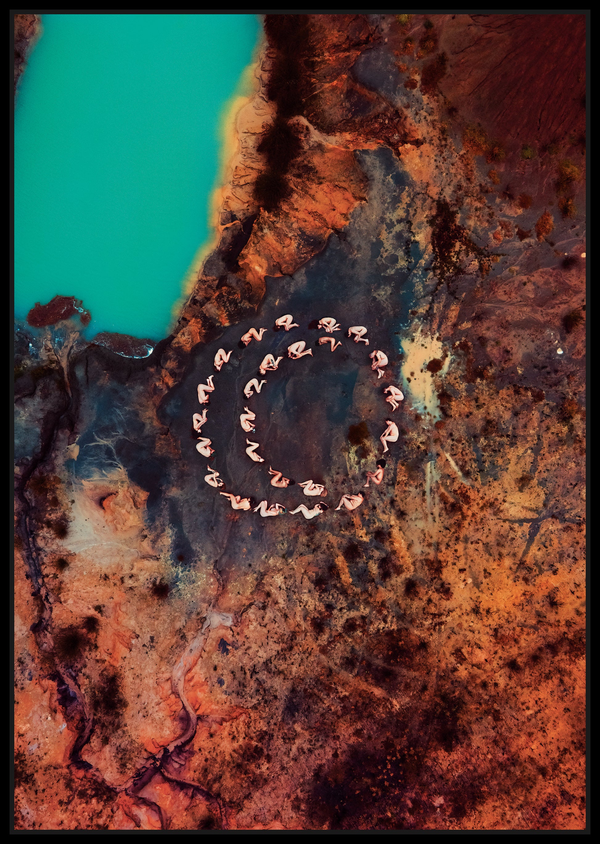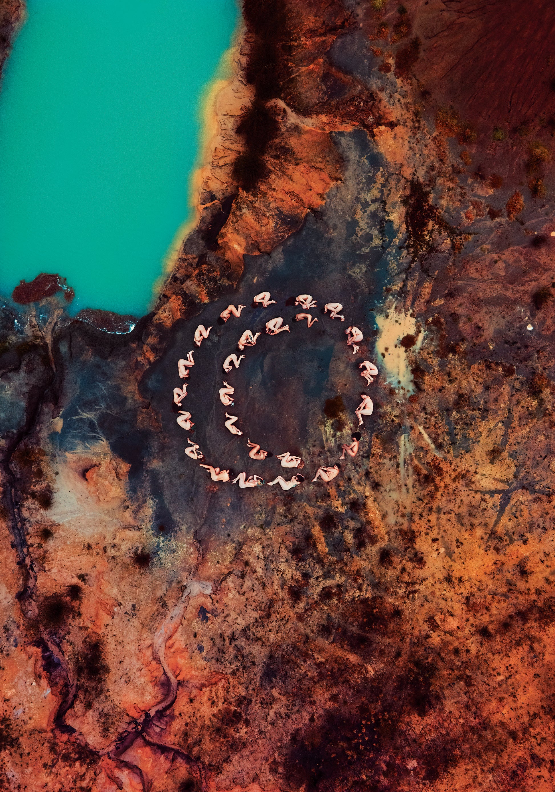 A beautiful piece of nude art inspired by Sacred Geometry and the Yogic culture. The image was created by arranging 25 people into a shape that symbolizes the "Crescent Moon", which has been used in many traditions to depict the Sacral center or Chakra, the origin of life, creativity and sexuality. The colors in the artwork are an effect of the different mineral deposits in the clay soil and the shapes that the water has made in its erosion process. A piece created straight with nature, combining a human, psychological and spiritual aspect.